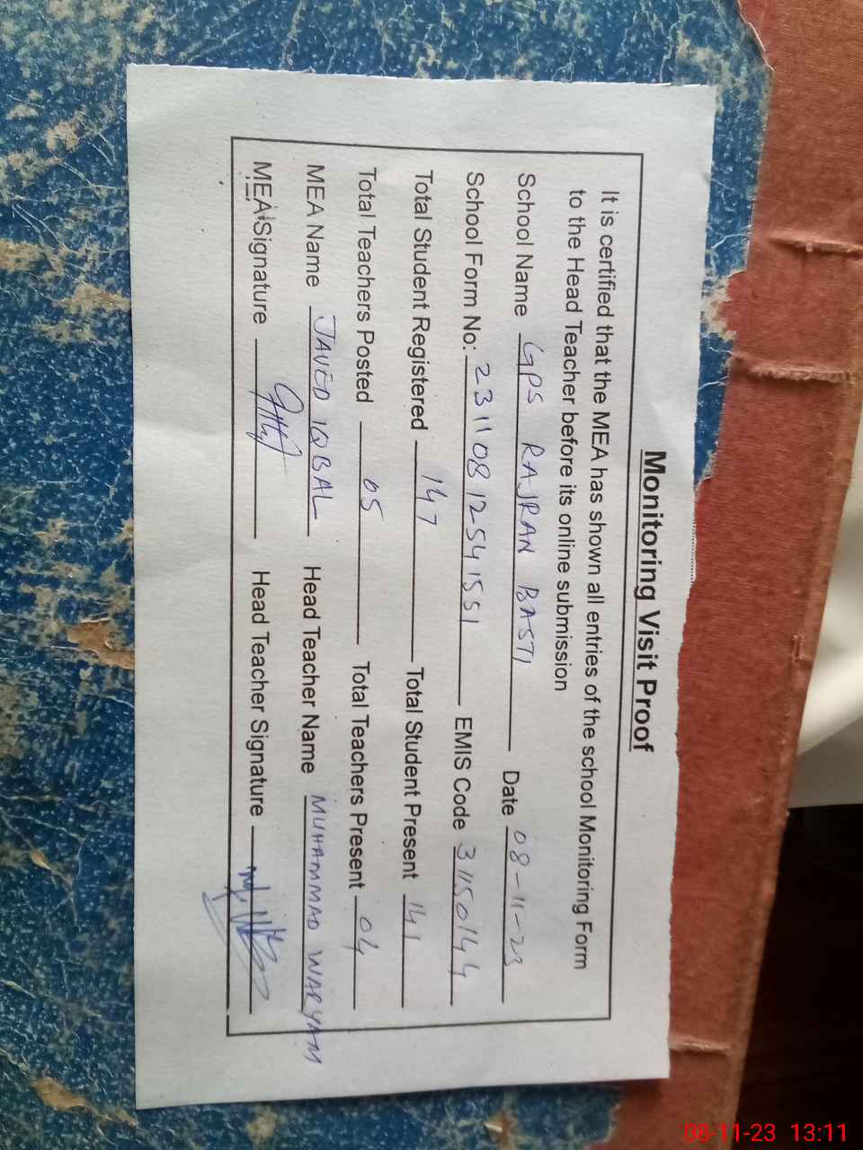 | Attendance Register | Head Teacher | MEA with School | Visit Proof |