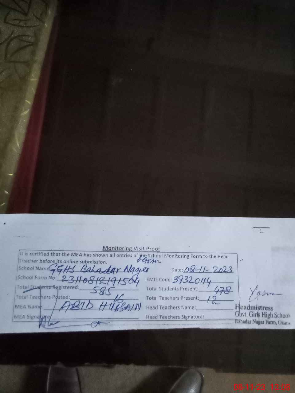 | Attendance Register | Head Teacher | MEA with School | Visit Proof |