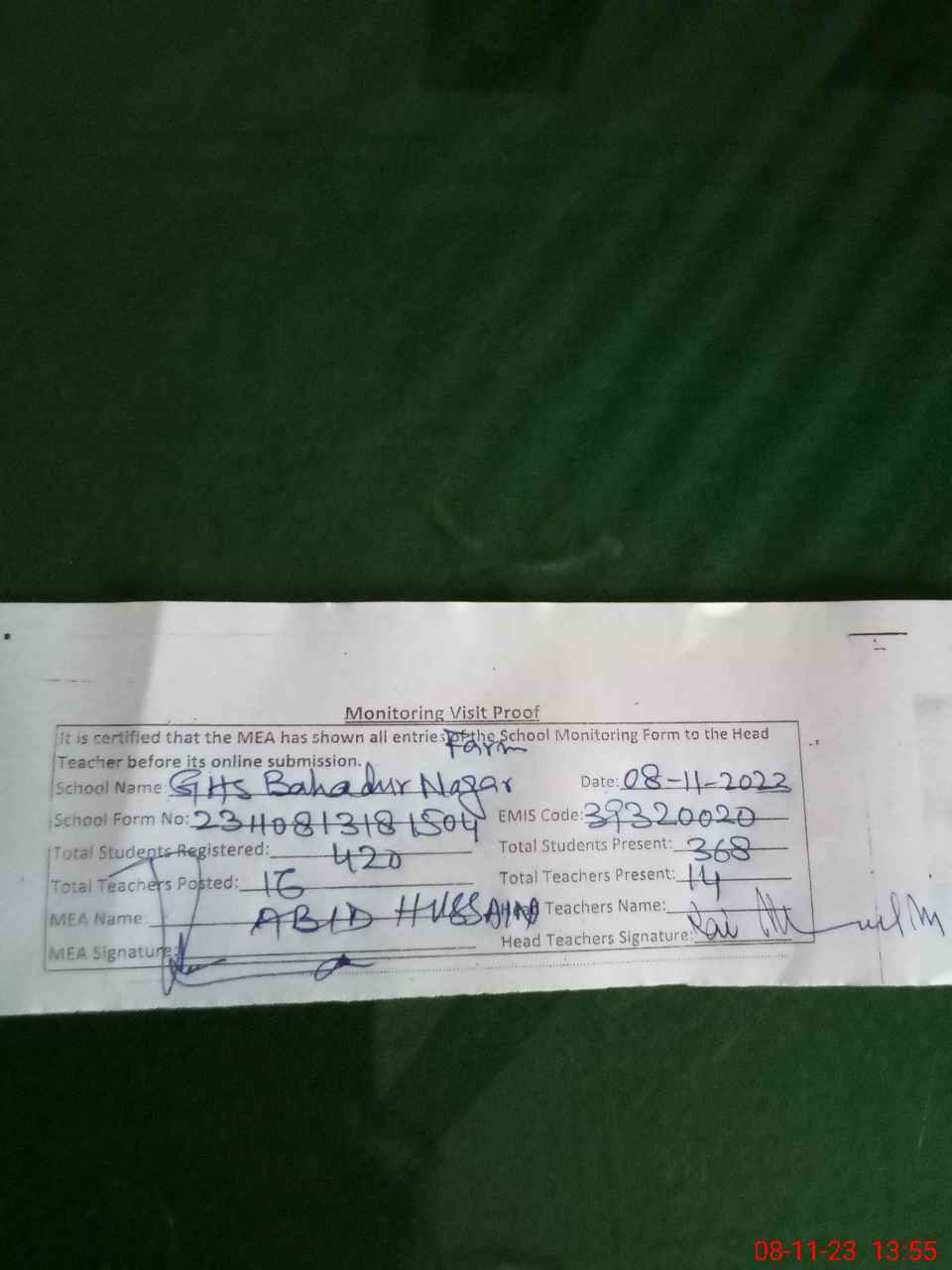 | Certified that this School was Inspected by the Undersigned MEA/DMO Today and the Information Stated Above is as Per Record. | |||||