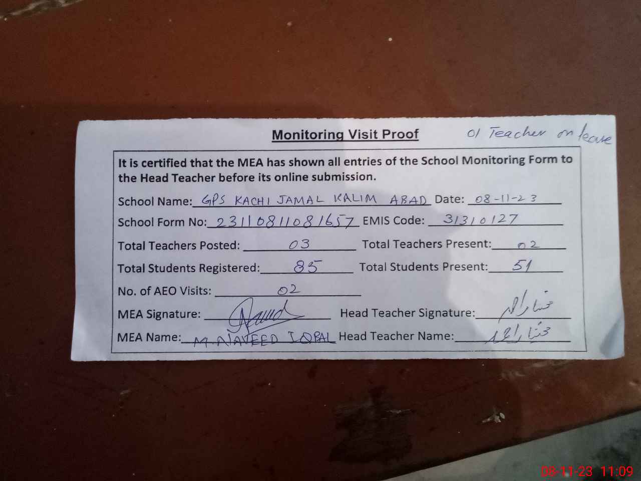 | EMIS Code: 31310127 | Name of School: GPS KACHI JAMAL KALIM ABAD (After Noon) | |||