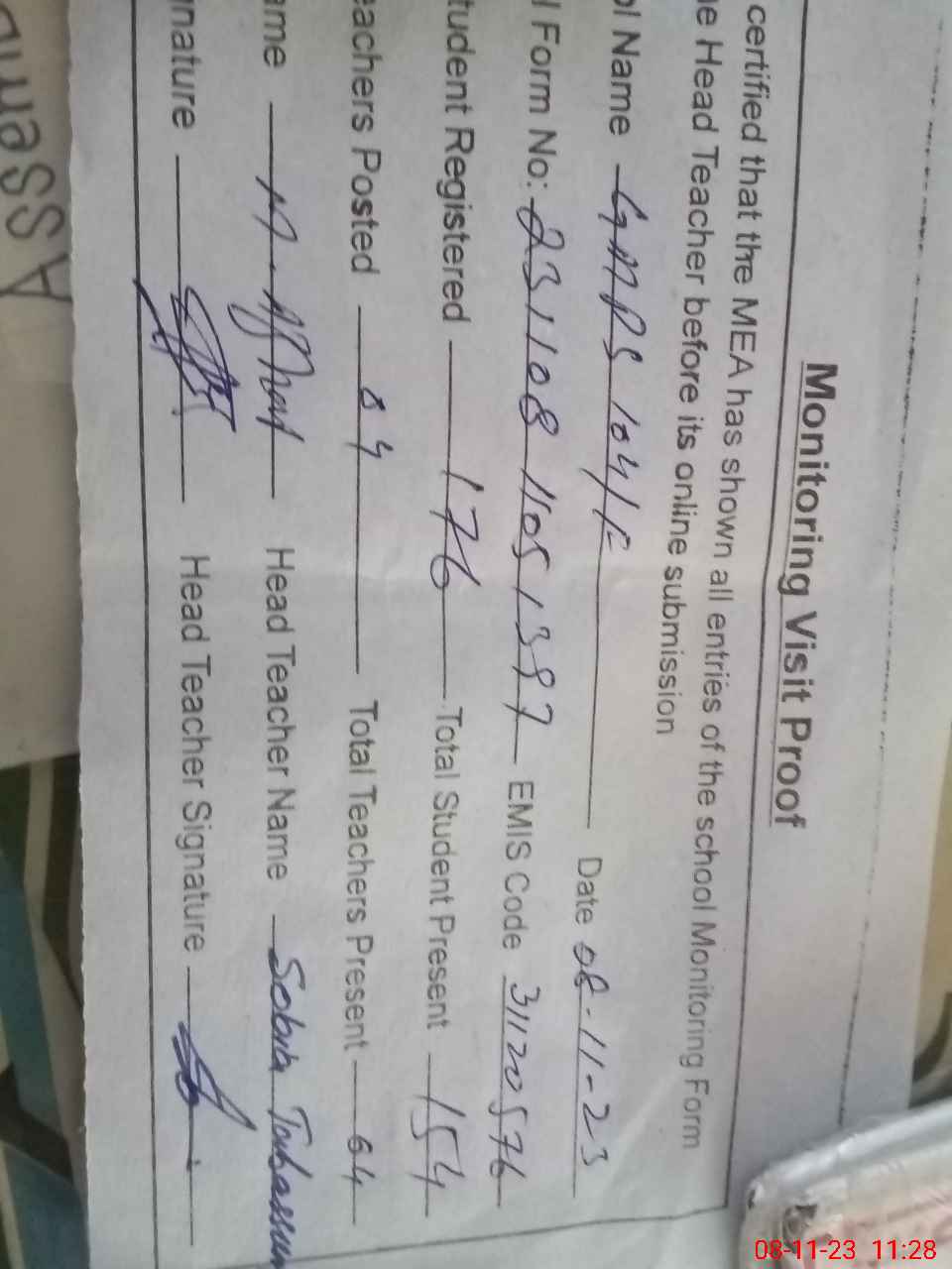 | Attendance Register | Head Teacher | MEA with School | Visit Proof |