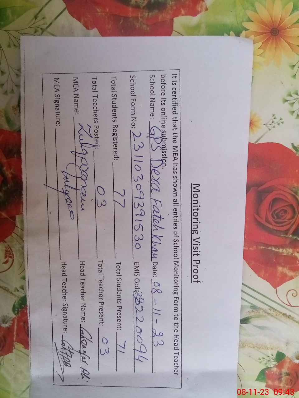 | EMIS Code: 38220094 | Name of School: GPS DERA FATEH KHAN | |||