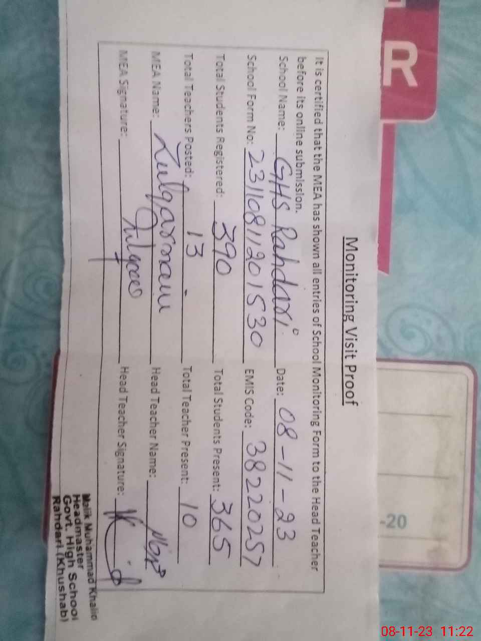 | Attendance Register | Head Teacher | MEA with School | Visit Proof |