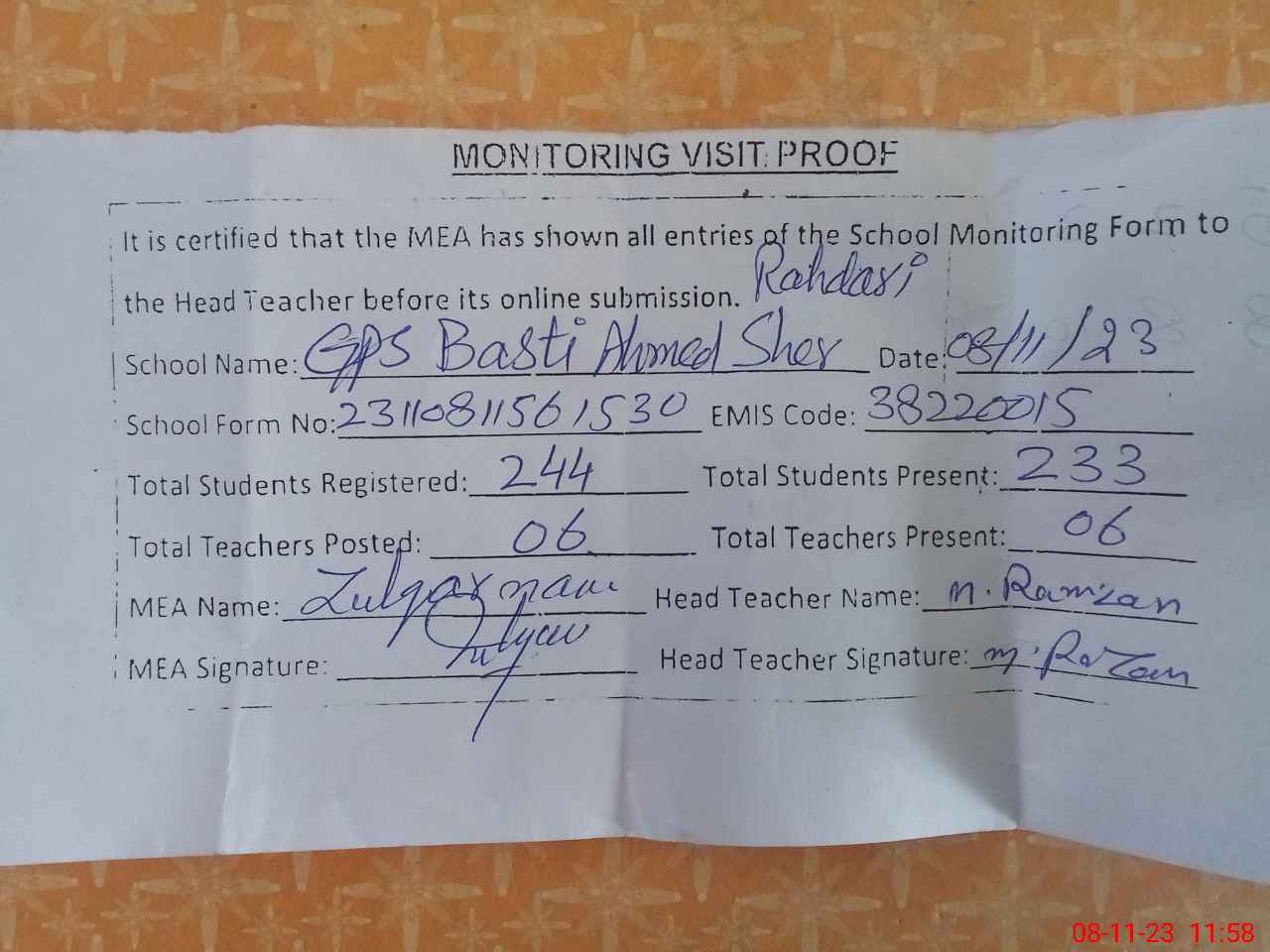 | Attendance Register | Head Teacher | MEA with School | Visit Proof |