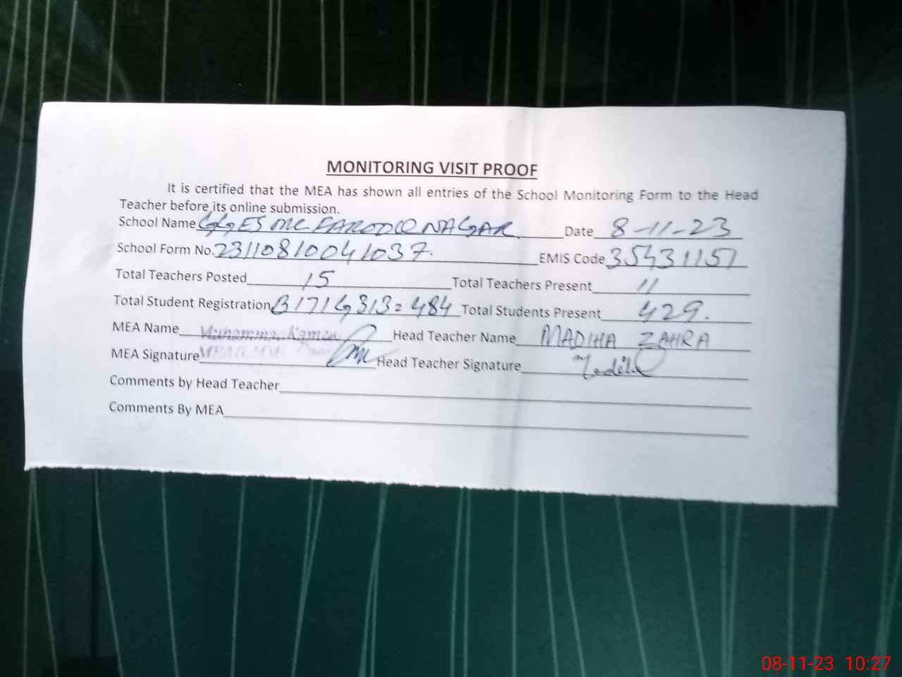 | Attendance Register | Head Teacher | MEA with School | Visit Proof |