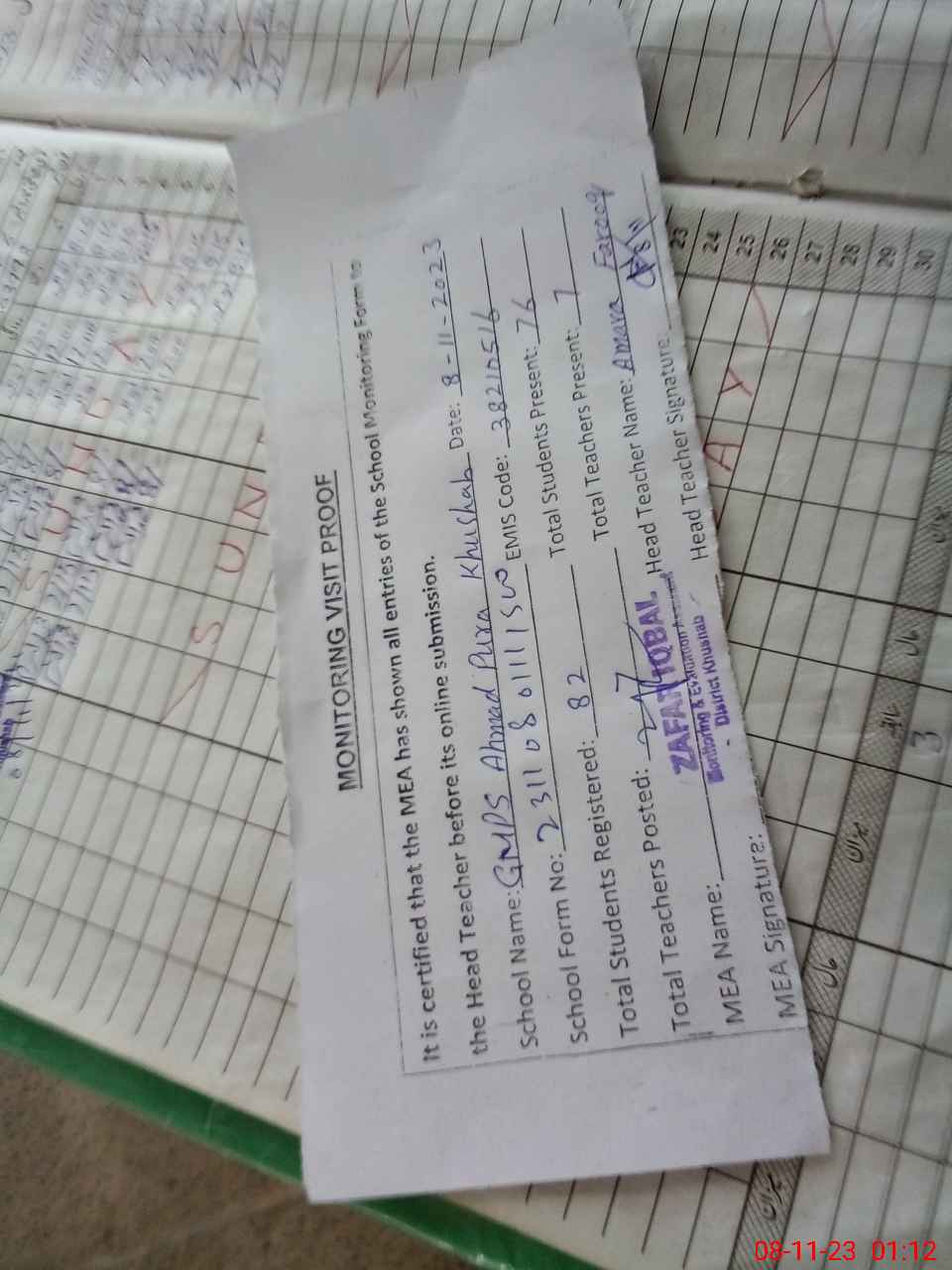| Attendance Register | Head Teacher | MEA with School | Visit Proof |