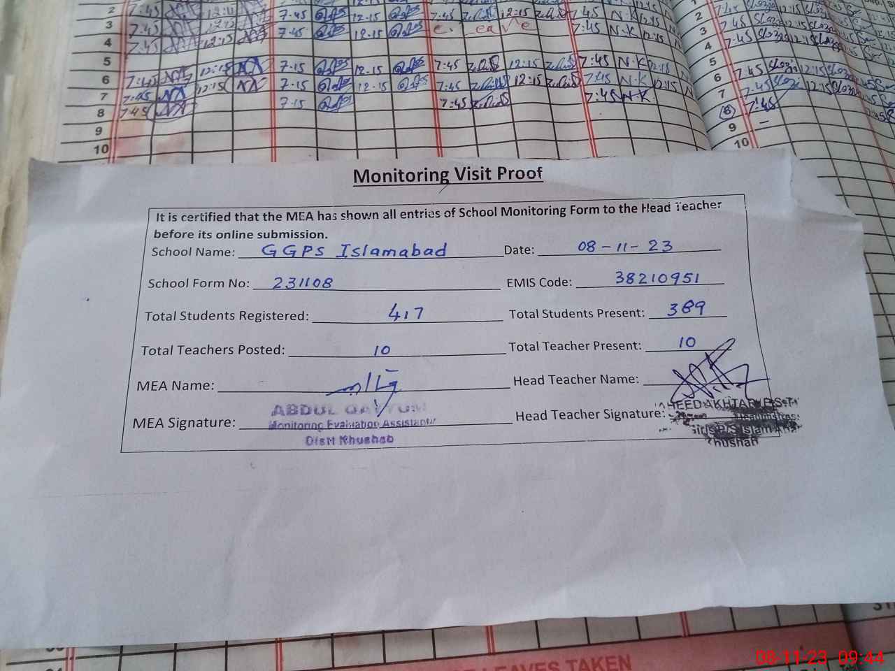 | Attendance Register | Head Teacher | MEA with School | Visit Proof |