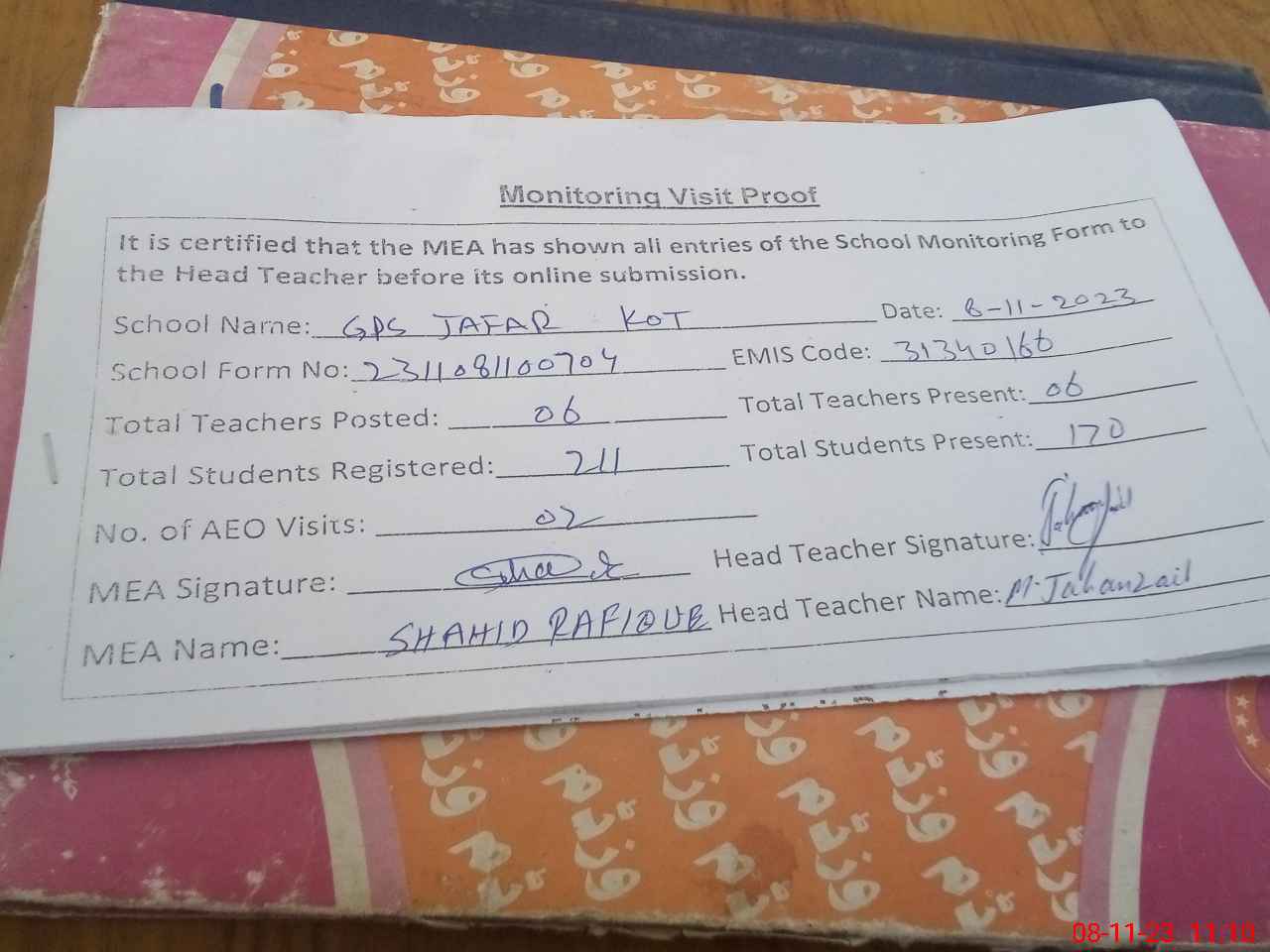 | Attendance Register | Head Teacher | MEA with School | Visit Proof |