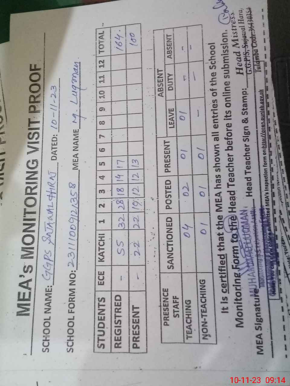 | Monitoring Date: 10-11-2023 | Start Time: 10-11-2023 08:52 AM | End Time: 10-11-2023 09:15 AM | Name of MEA: Mu**** Lu**** | |