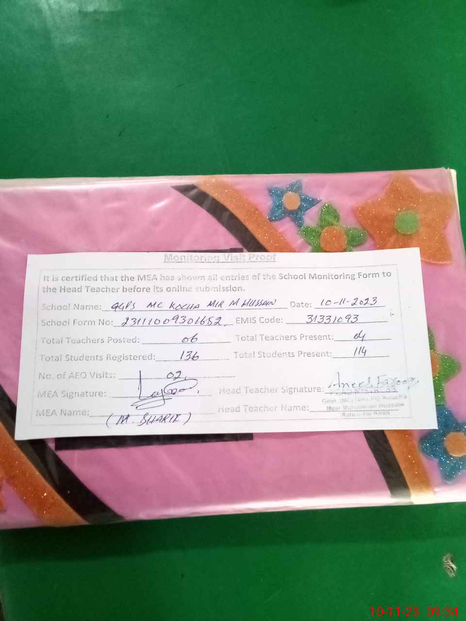 | Attendance Register | Head Teacher | MEA with School | Visit Proof |