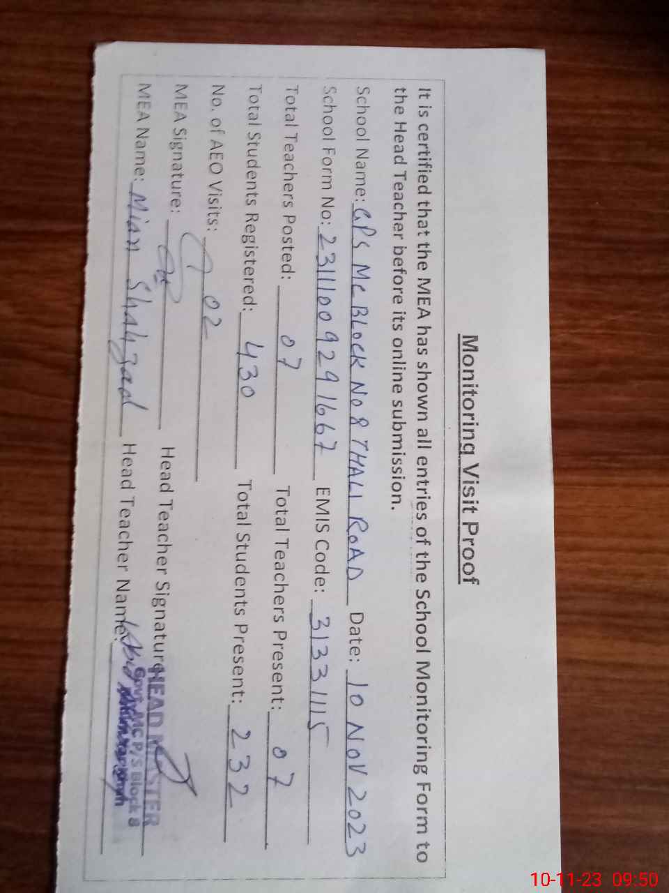 | EMIS Code: 31331115 | Name of School: GPS MC BLOCK NO. 8 THALI ROAD | |||