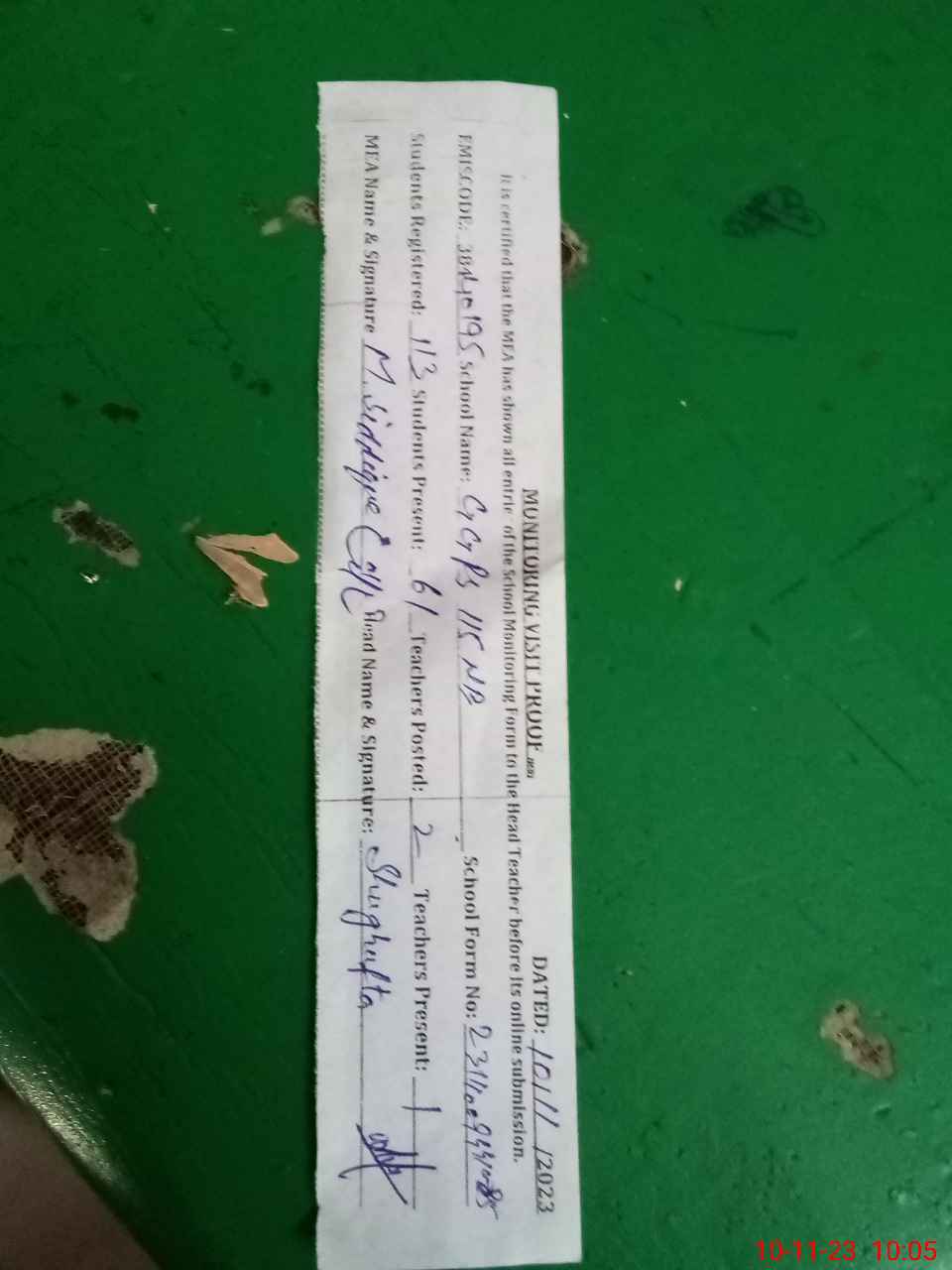 | Monitoring Date: 10-11-2023 | Start Time: 10-11-2023 09:44 AM | End Time: 10-11-2023 10:10 AM | Name of MEA: MU**** SI**** | |