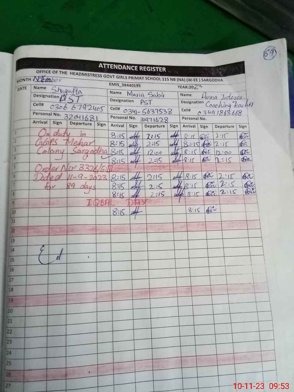 | Name: SH**** Designation: (School Headmaster's/Headmistress's) PST (ARTS) Phone/Cell Number: 03**** |