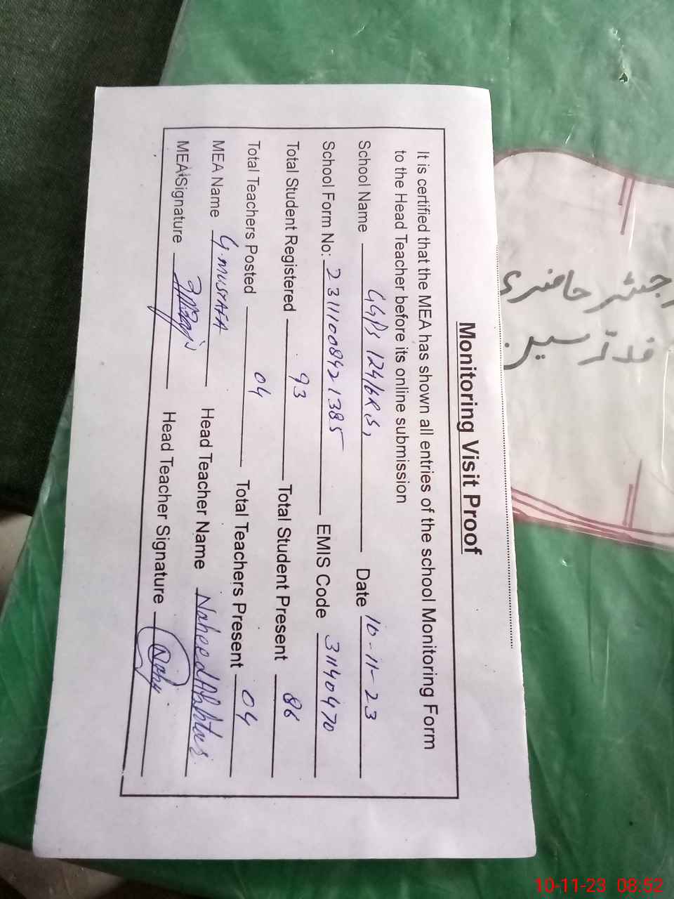 | Attendance Register | Head Teacher | MEA with School | Visit Proof |