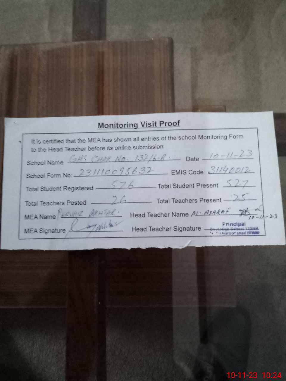 | Attendance Register | Head Teacher | MEA with School | Visit Proof |
