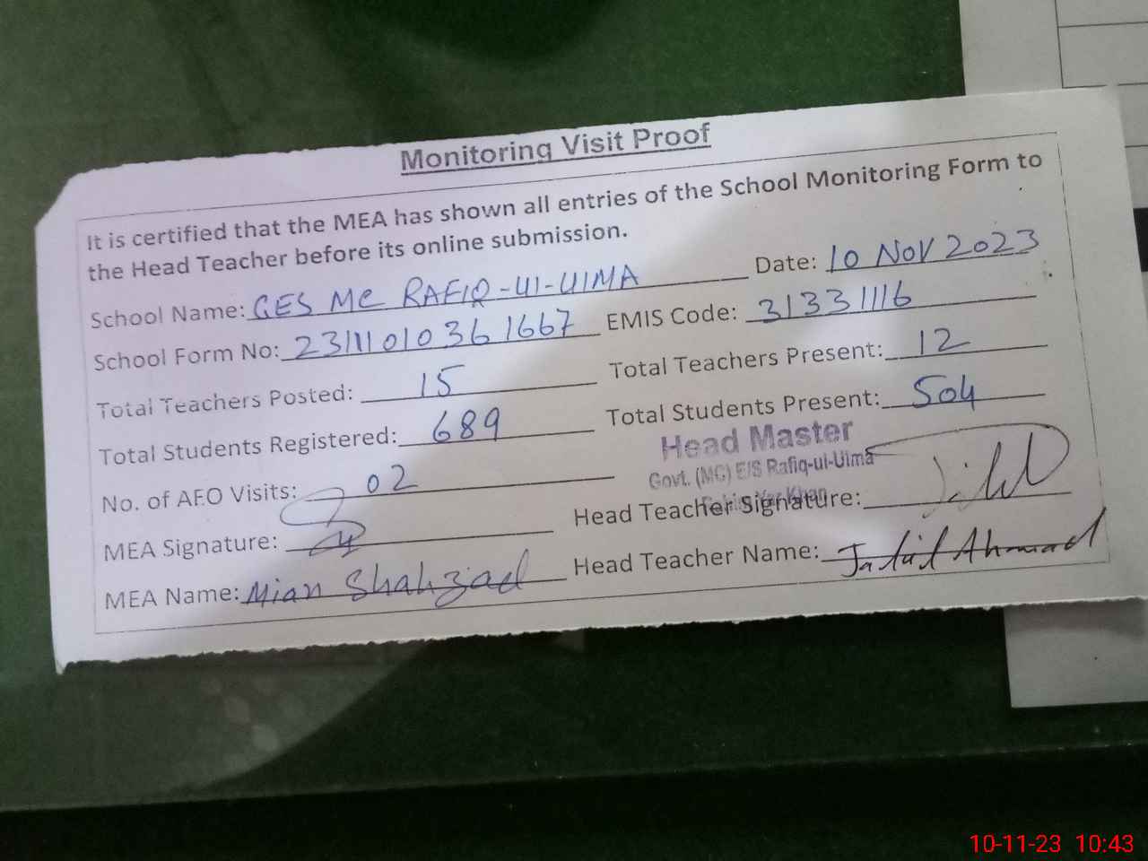 | Attendance Register | Head Teacher | MEA with School | Visit Proof |