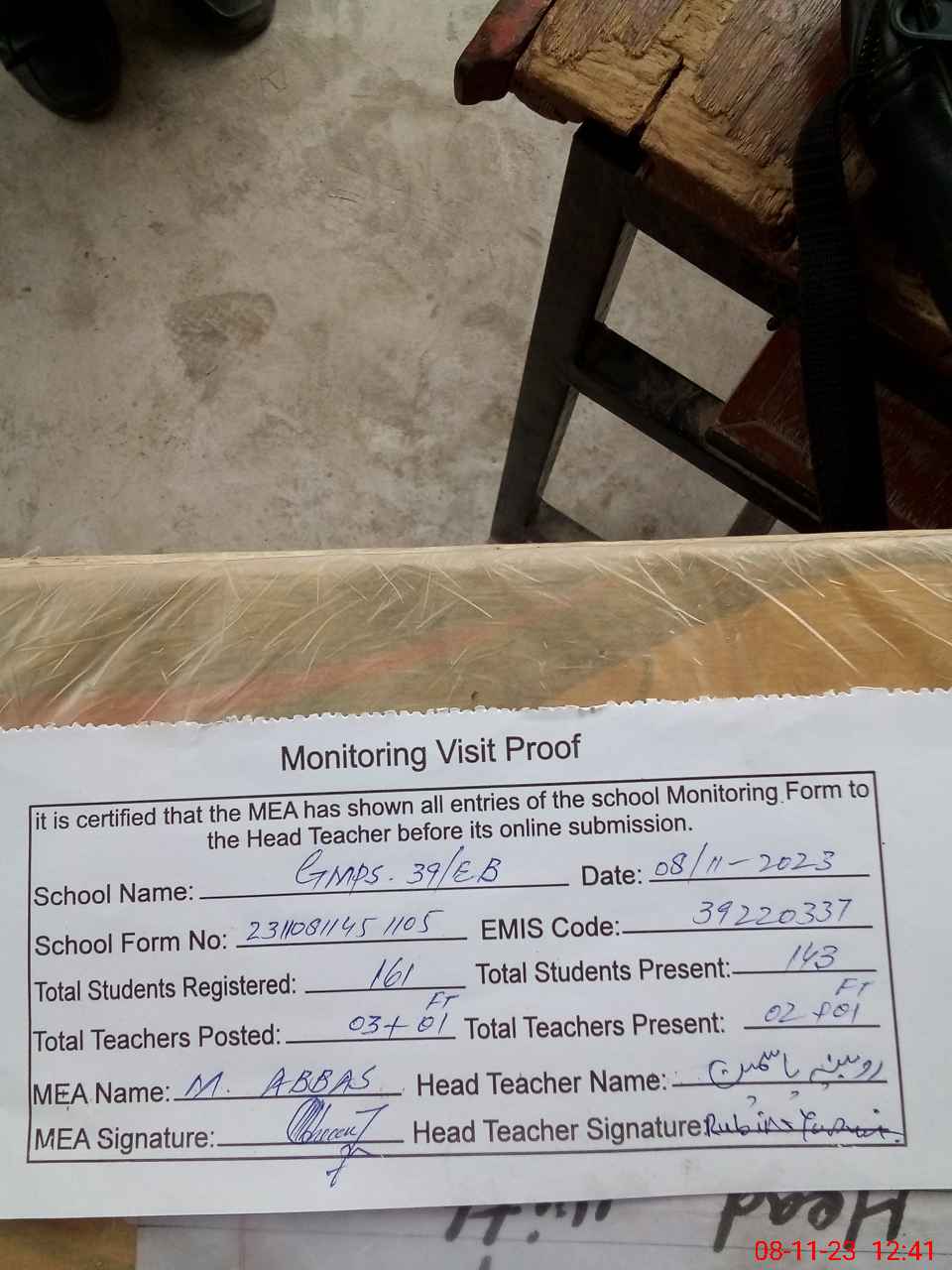 | Attendance Register | Head Teacher | MEA with School | Visit Proof |