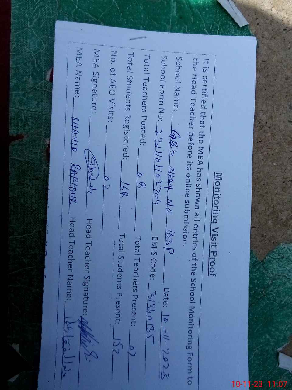 | Attendance Register | Head Teacher | MEA with School | Visit Proof |
