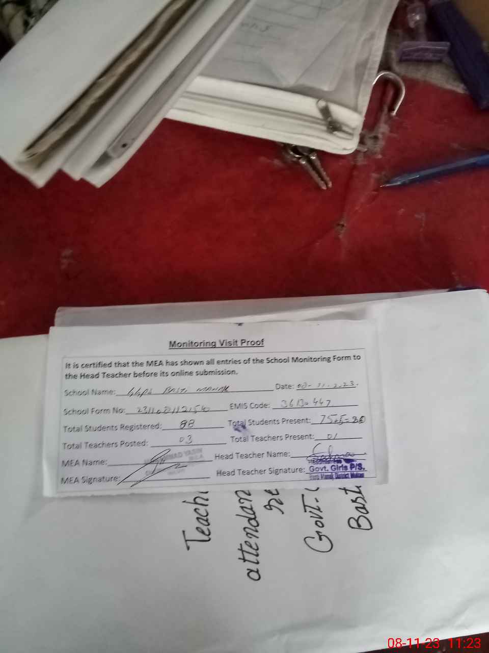 | Attendance Register | Head Teacher | MEA with School | Visit Proof |