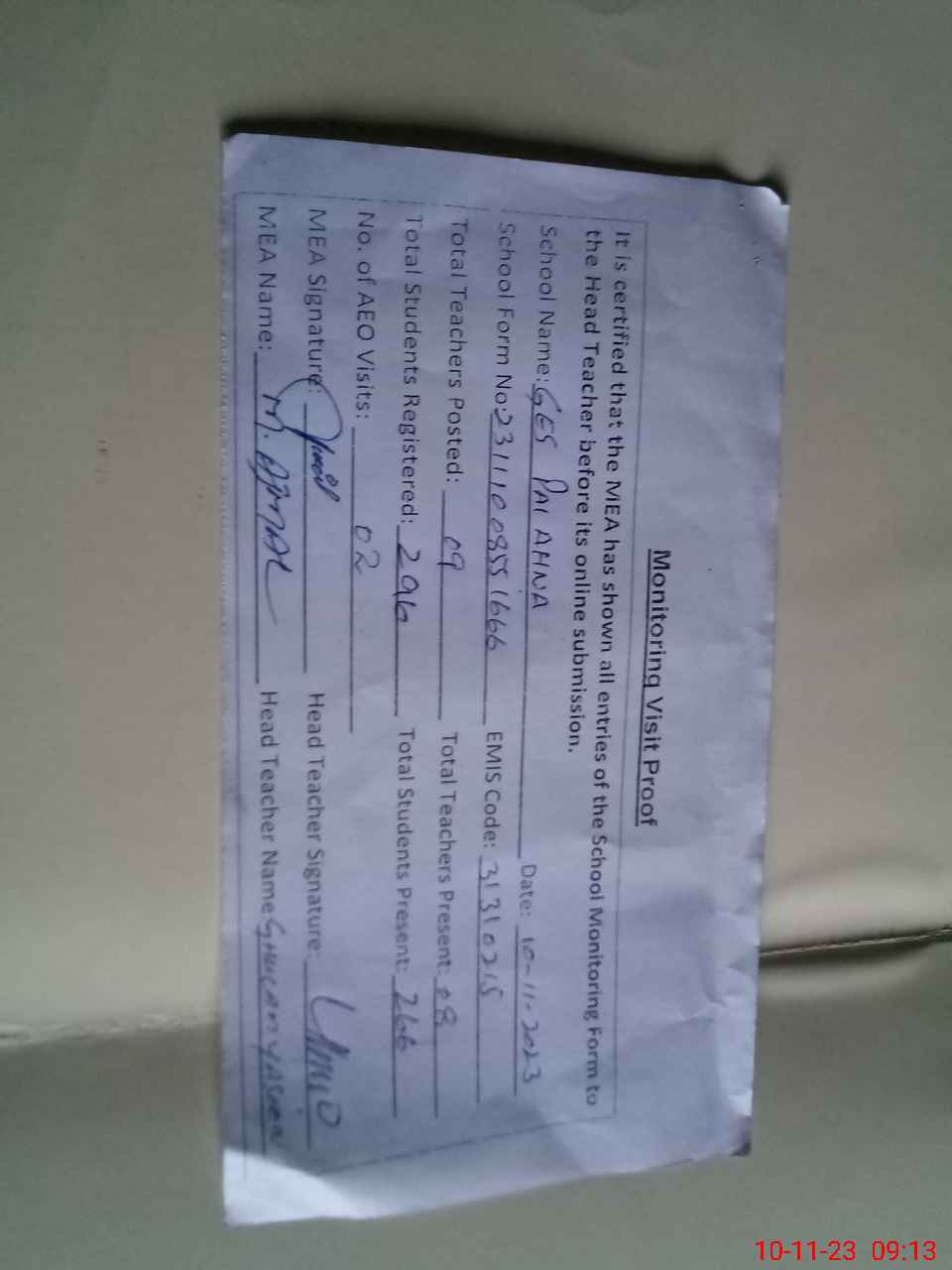 | Attendance Register | Head Teacher | MEA with School | Visit Proof |