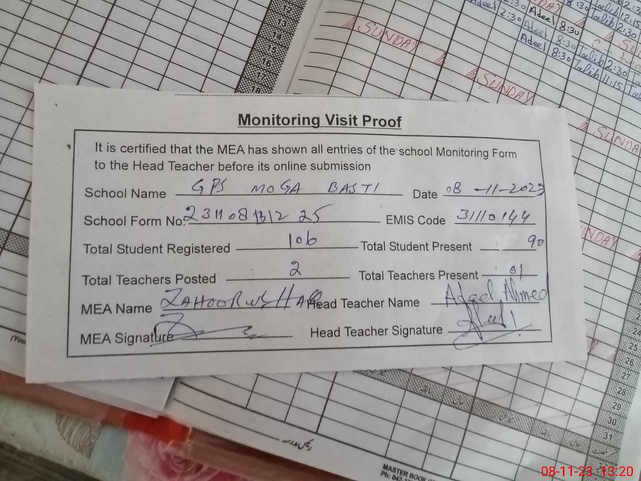 | Attendance Register | Head Teacher | MEA with School | Visit Proof |
