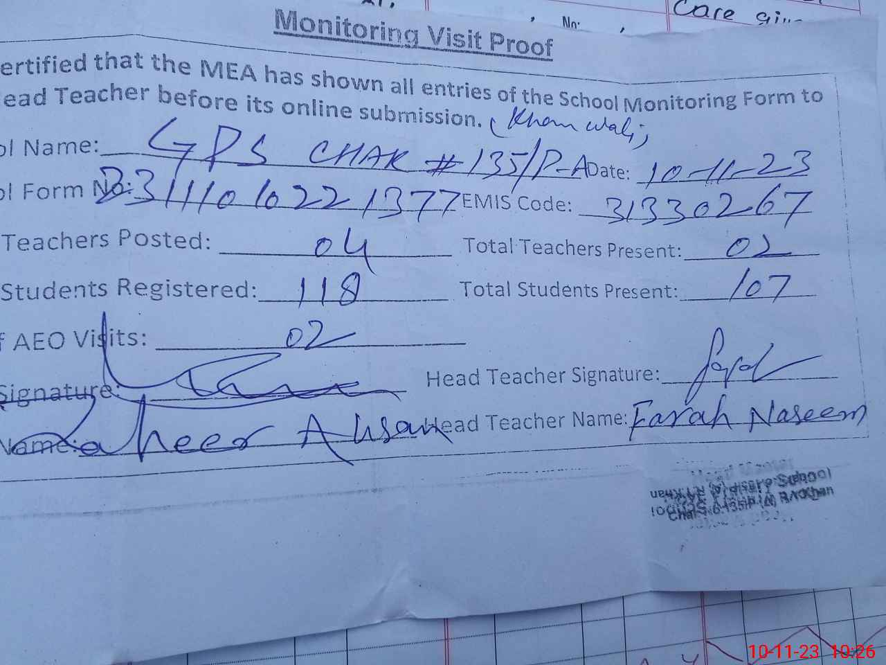 | Attendance Register | Head Teacher | MEA with School | Visit Proof |