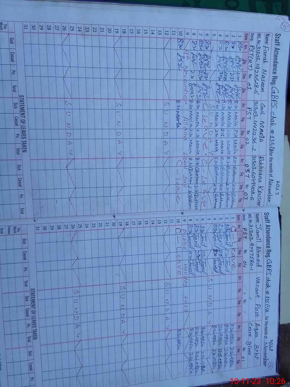 | CNIC | Full Name | Designation | R/C | Absence During Last Calender Month |