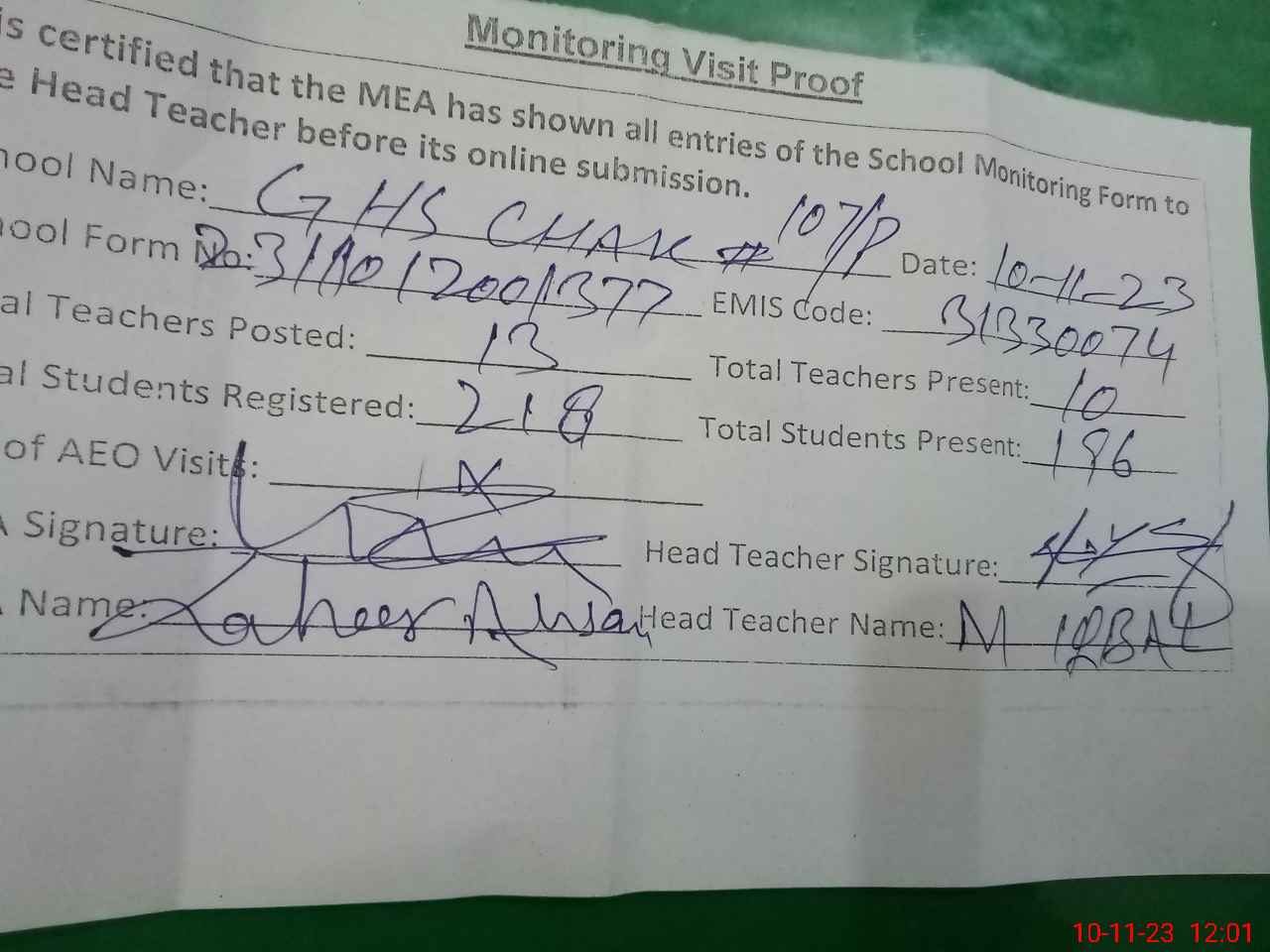 | Attendance Register | Head Teacher | MEA with School | Visit Proof |