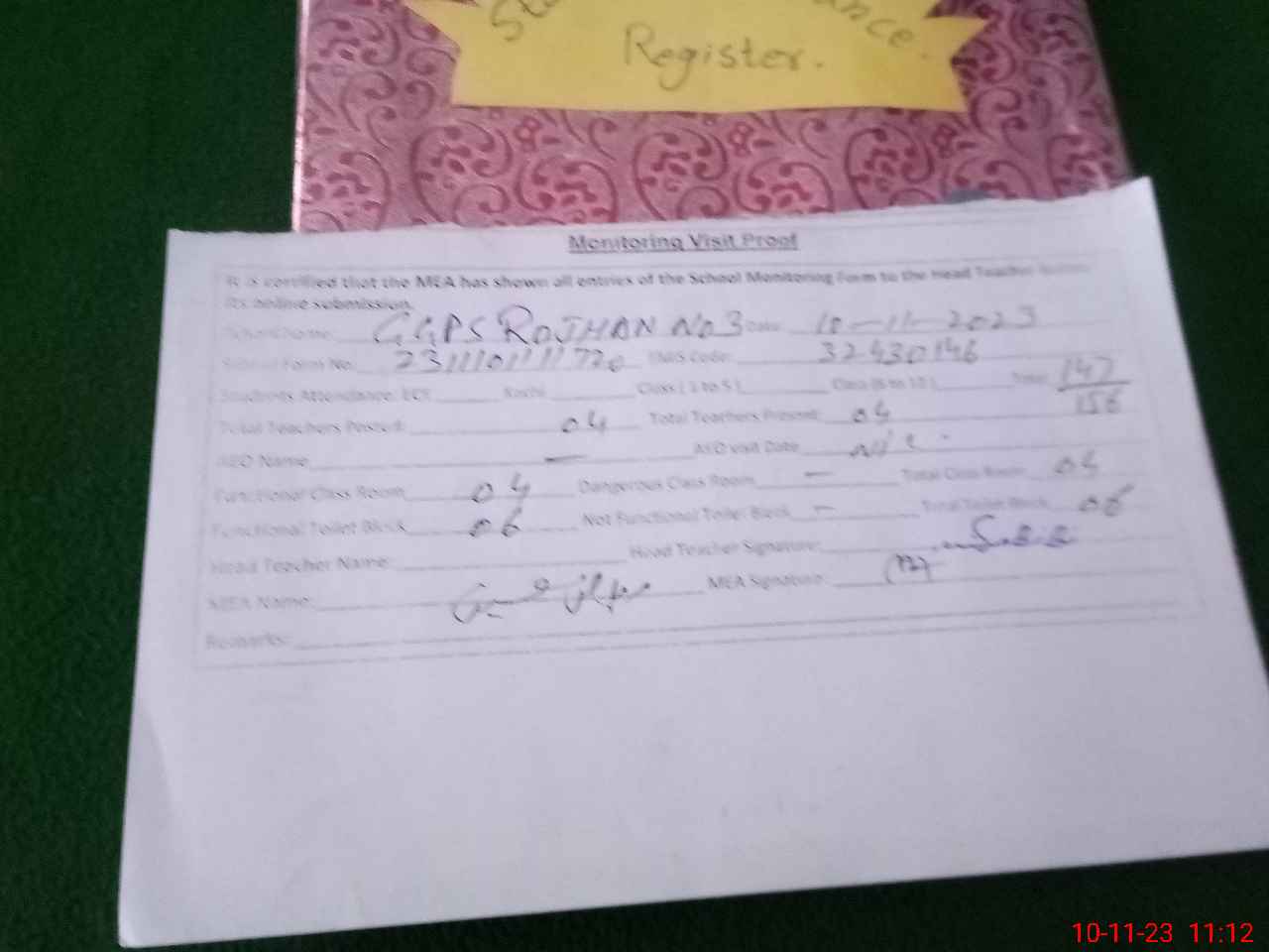 | Attendance Register | Head Teacher | MEA with School | Visit Proof |