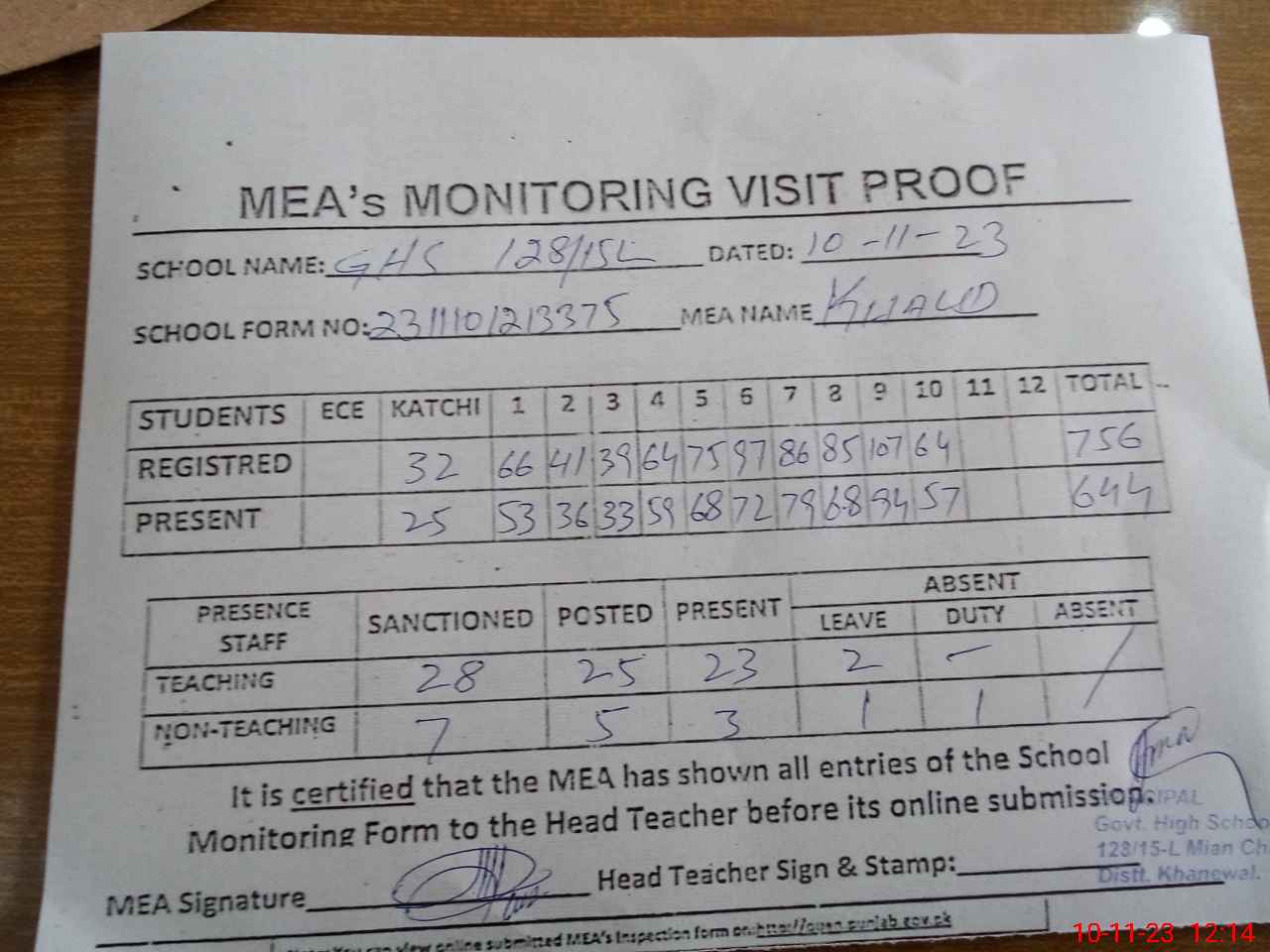 | Attendance Register | Head Teacher | MEA with School | Visit Proof |