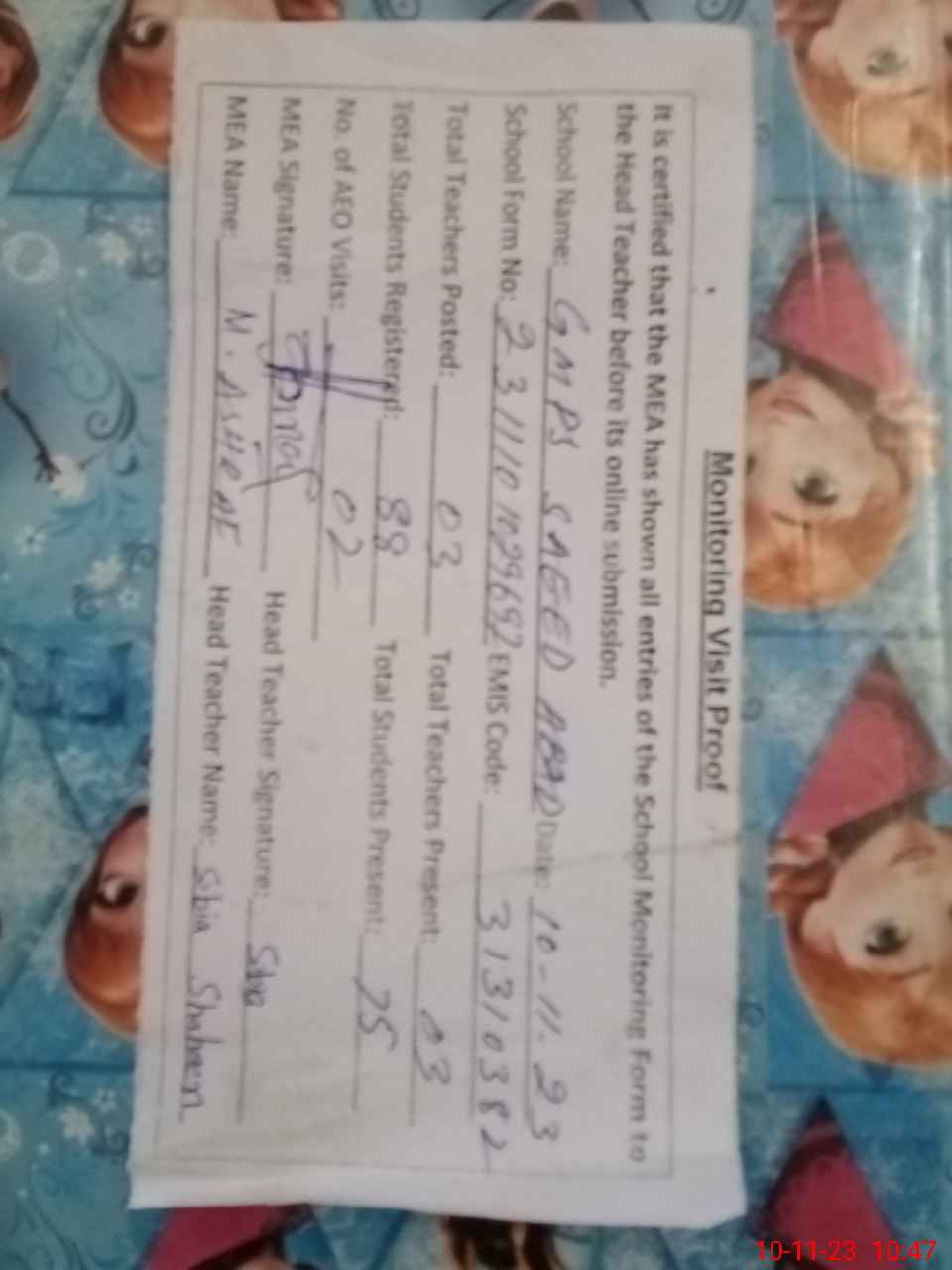 | EMIS Code: 31310385 | Name of School: GMPS SAEED ABAD KHANPUR | |||