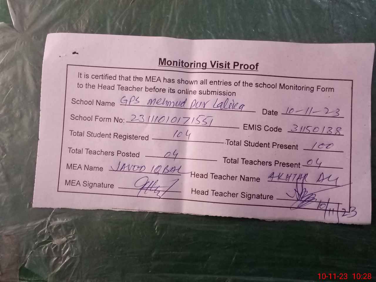 | Attendance Register | Head Teacher | MEA with School | Visit Proof |