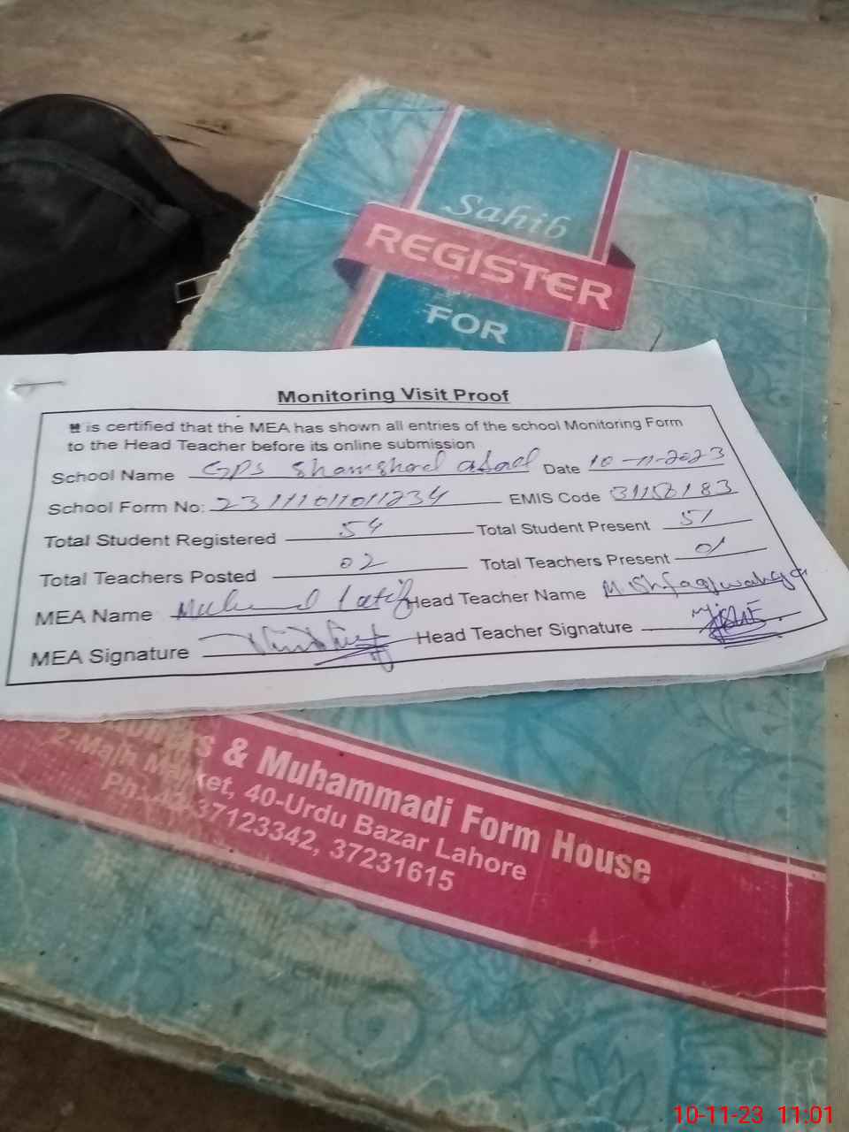 | Attendance Register | Head Teacher | MEA with School | Visit Proof |