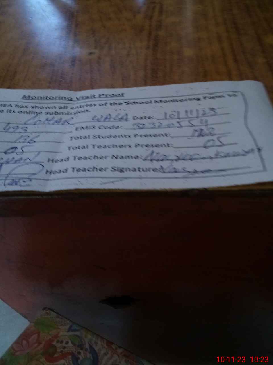 | Attendance Register | Head Teacher | MEA with School | Visit Proof |