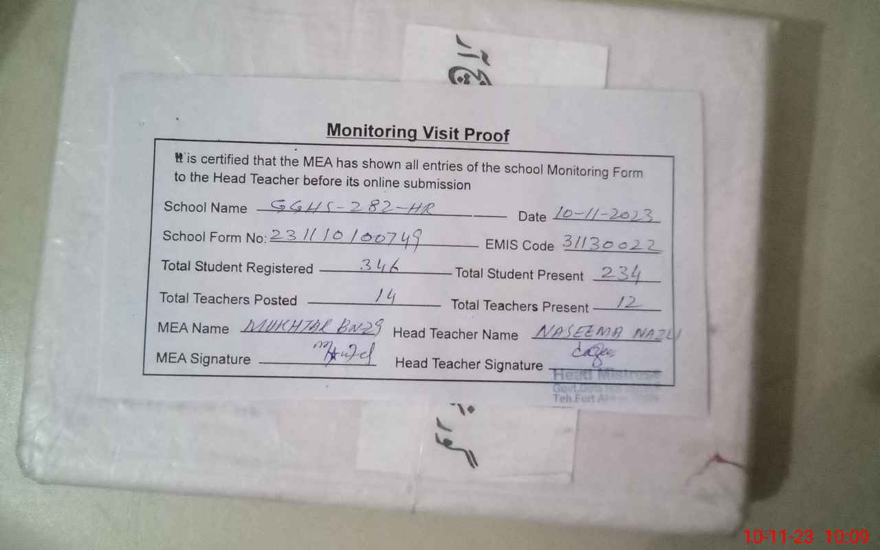 | EMIS Code: 31130022 | Name of School: GGHS CHAK NO 282 HR | |||