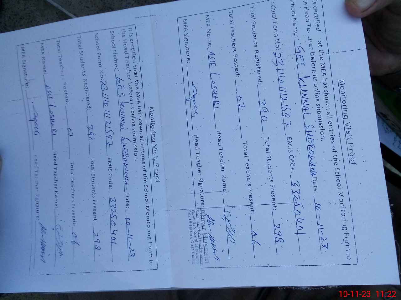 | Monitoring Date: 10-11-2023 | Start Time: 10-11-2023 10:43 AM | End Time: 10-11-2023 11:22 AM | Name of MEA: J-**** AS**** RA**** KH**** | |