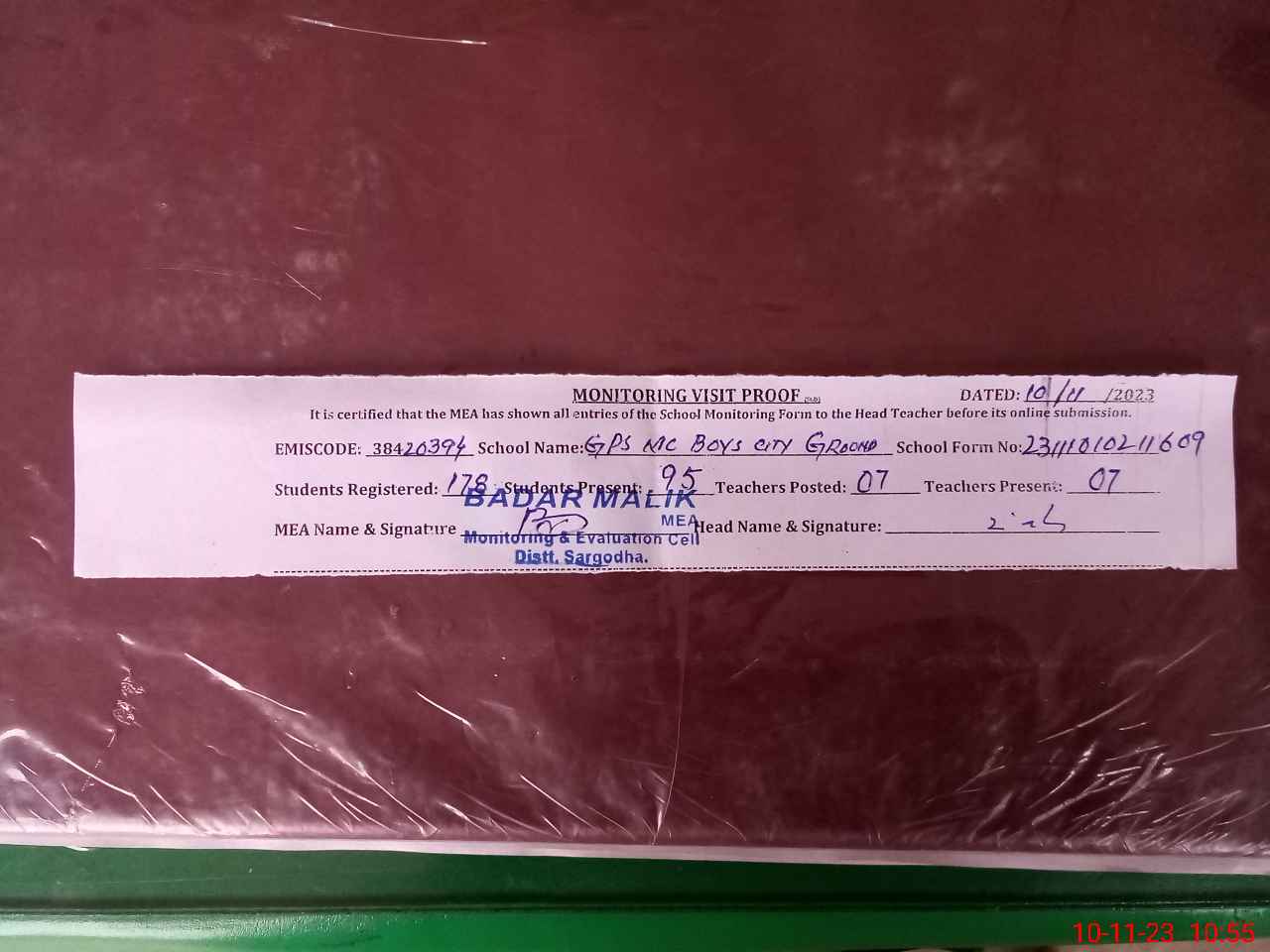 | EMIS Code: 38420394 | Name of School: GPS MC CITY GROUND SARGODHA | |||