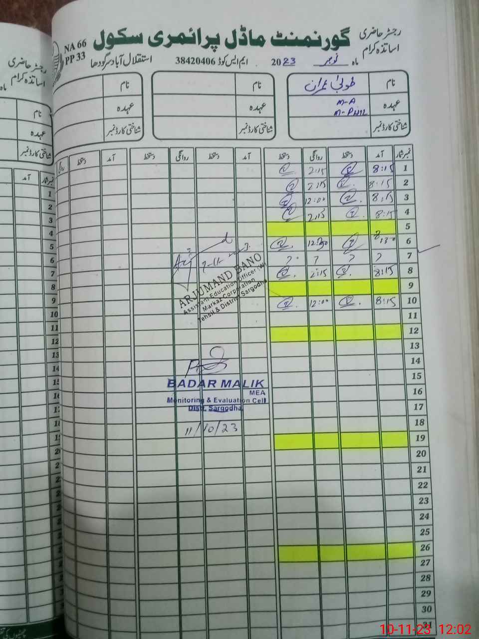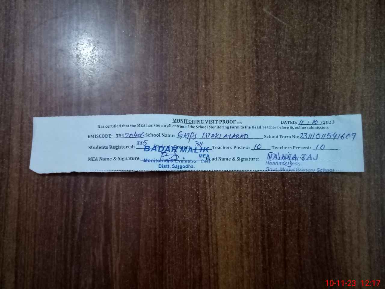 | Attendance Register | Head Teacher | MEA with School | Visit Proof |