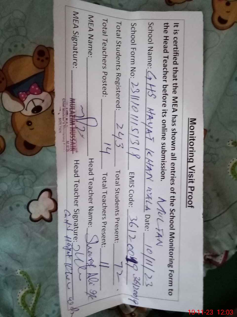 | EMIS Code: 36120019 | Name of School: GHS HAYAT KHAN WALA SHUJABAD | |||