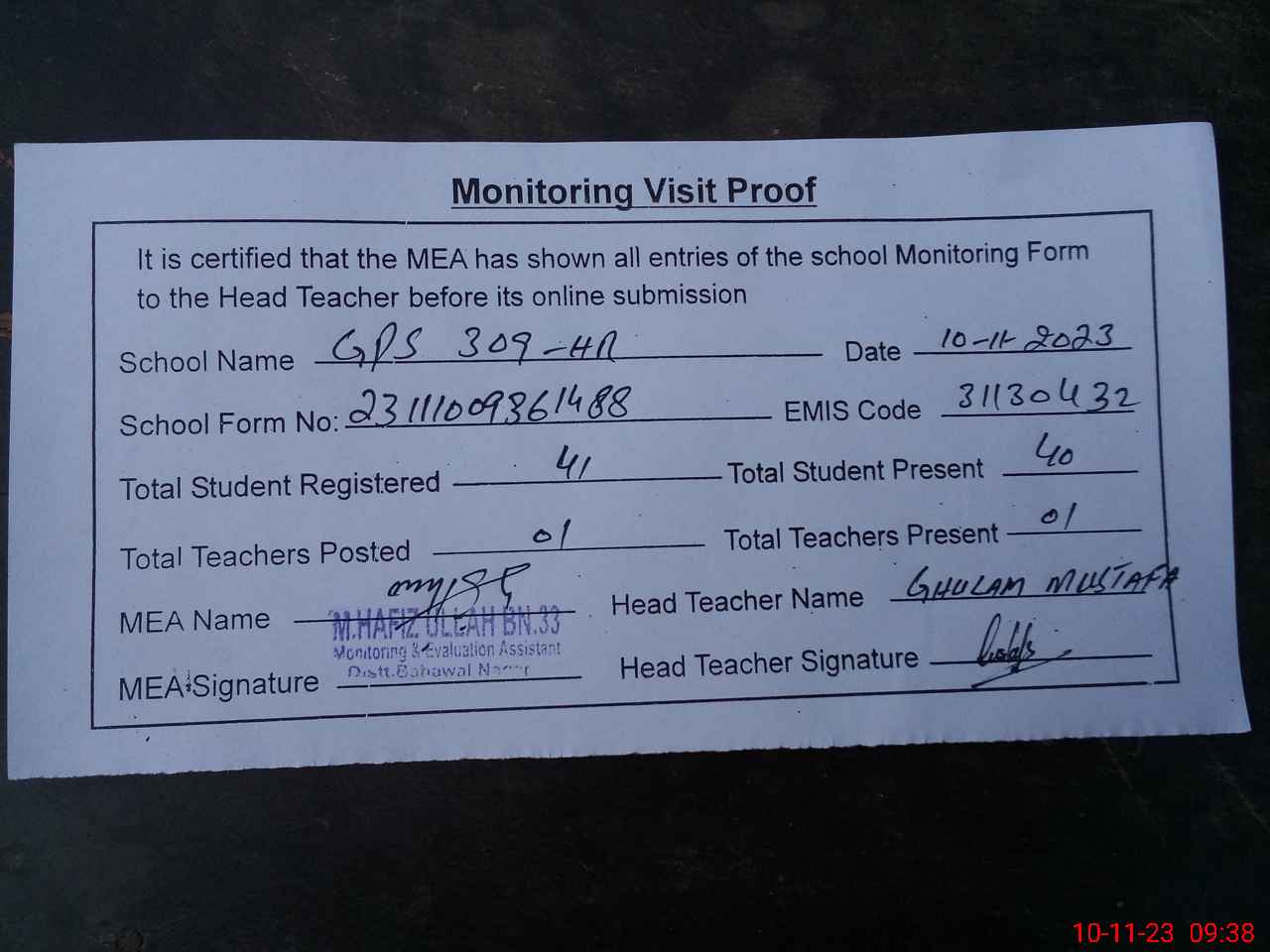 | Attendance Register | Head Teacher | MEA with School | Visit Proof |