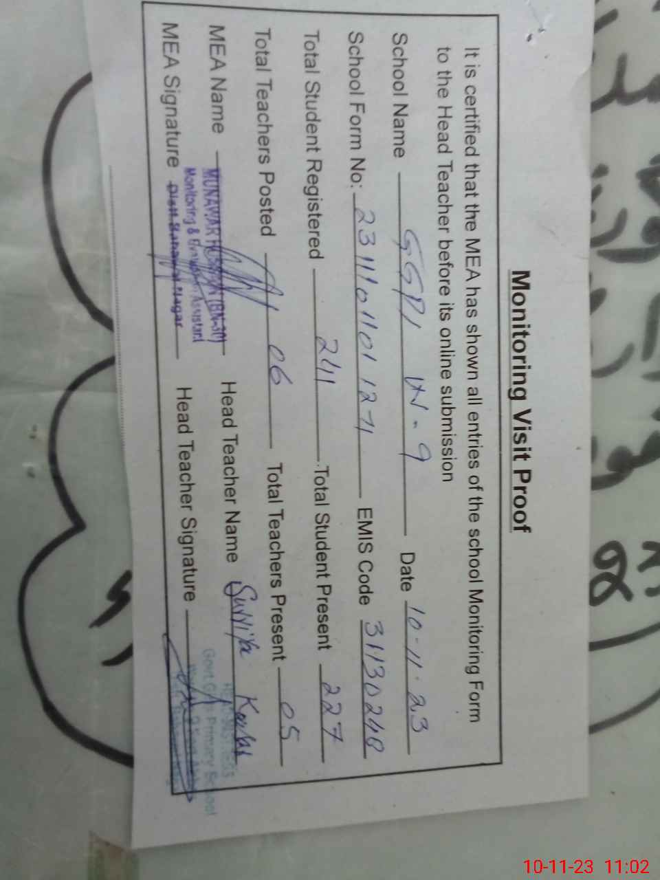 | Attendance Register | Head Teacher | MEA with School | Visit Proof |