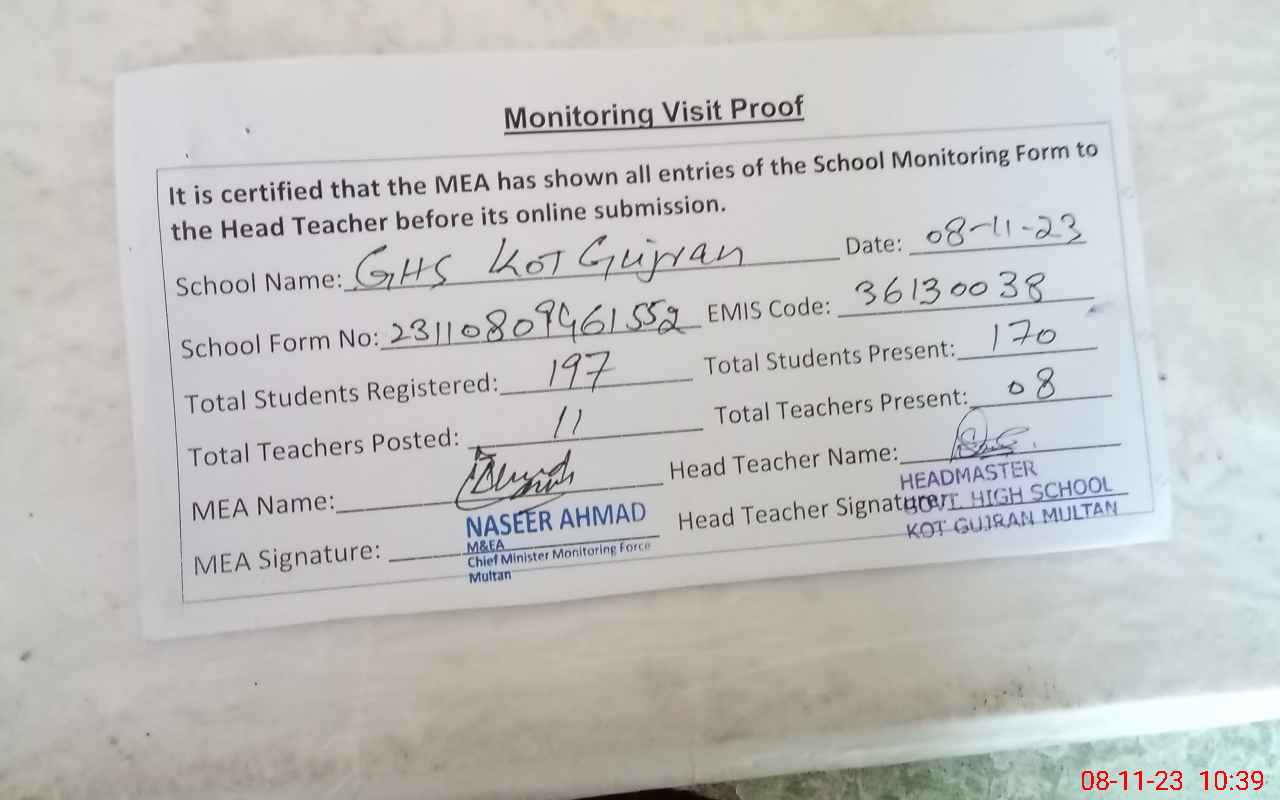| EMIS Code: 36130038 | Name of School: GHS KOT GUJRAN MULTAN | |||