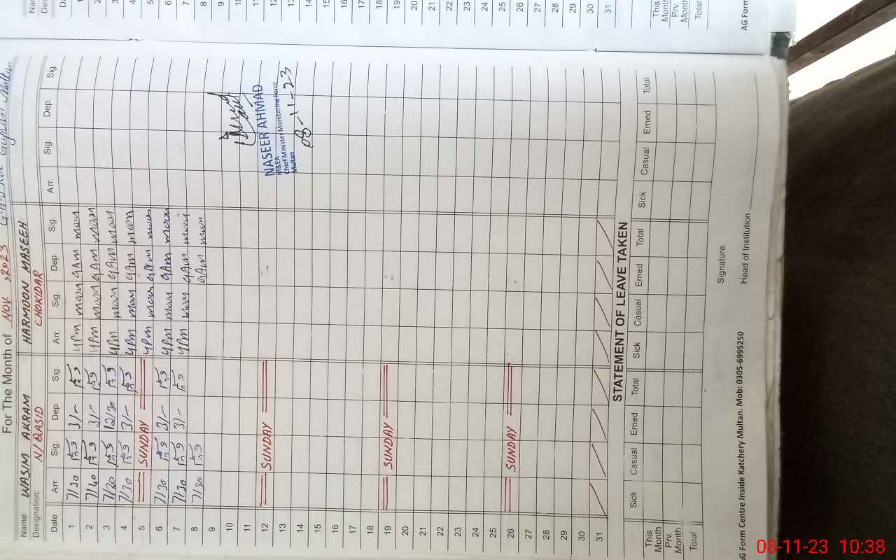 | CNIC | Full Name | Designation | R/C | Absence During Last Calender Month |