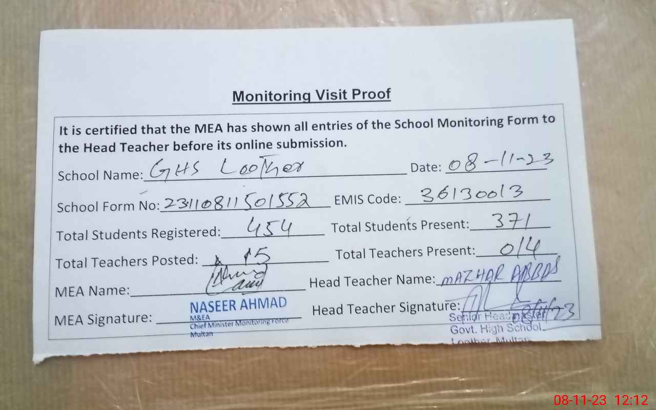 | EMIS Code: 36130013 | Name of School: GHS LOOTHER MULTAN | |||