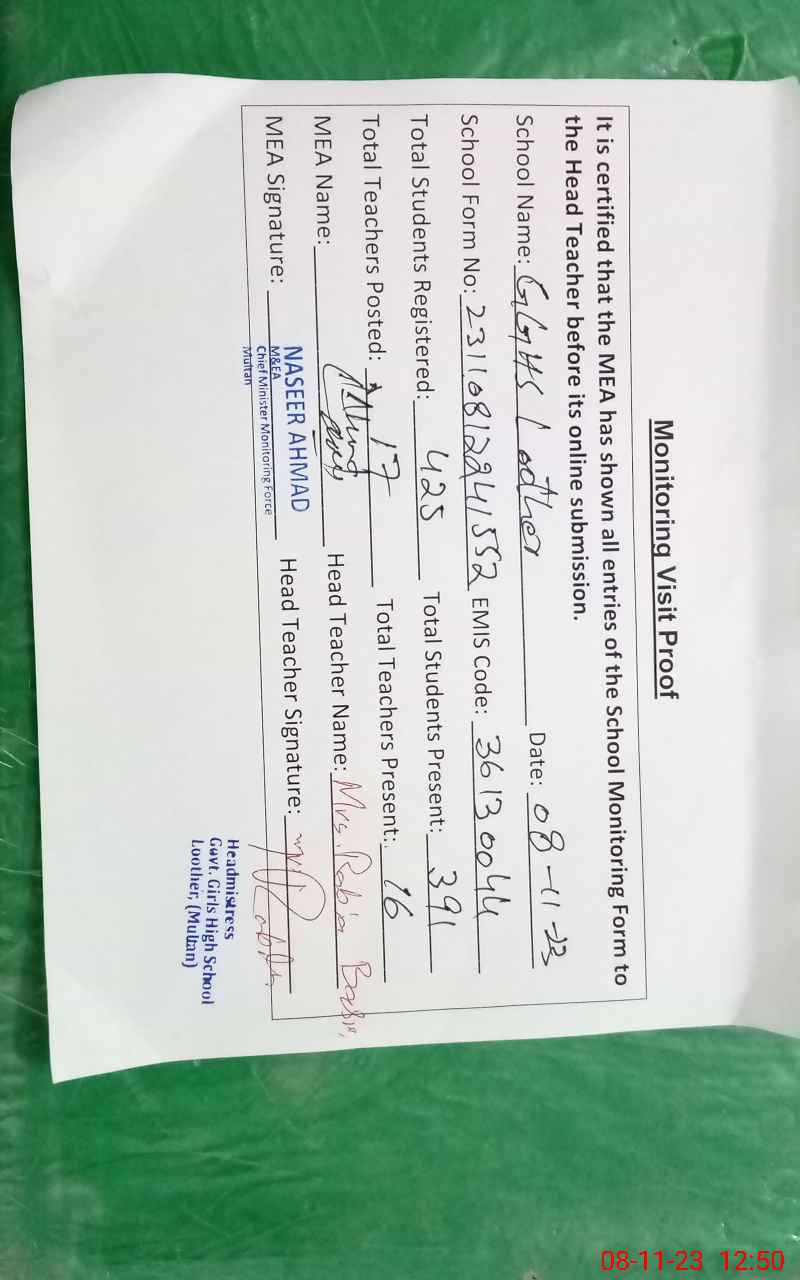 | EMIS Code: 36130044 | Name of School: GGHS LOOTHER MULTAN | |||