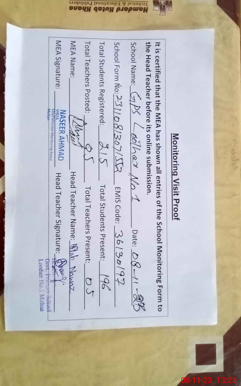 | EMIS Code: 36130197 | Name of School: GPS LOOTHER NO. 1 | |||