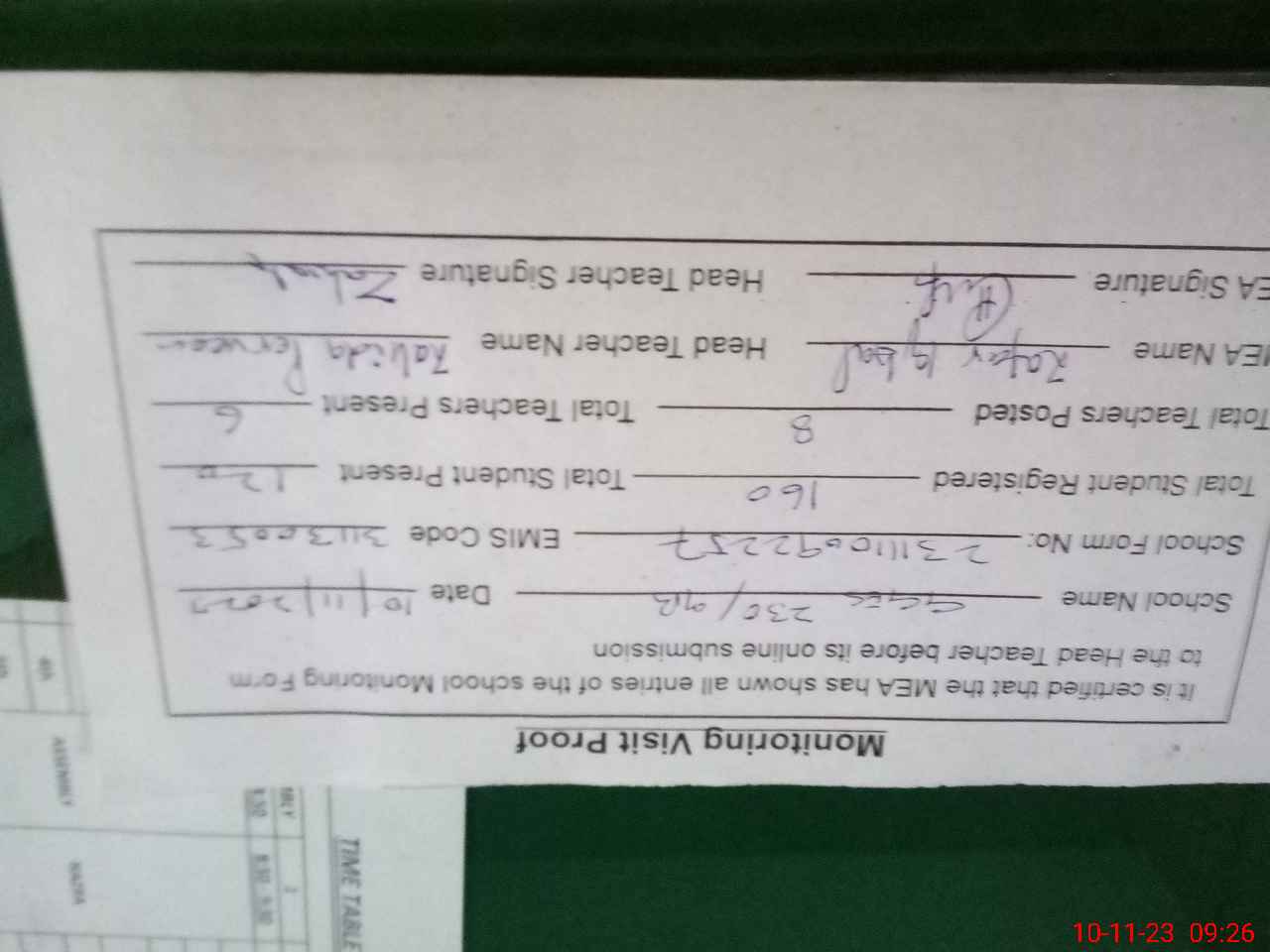 | Attendance Register | Head Teacher | MEA with School | Visit Proof |