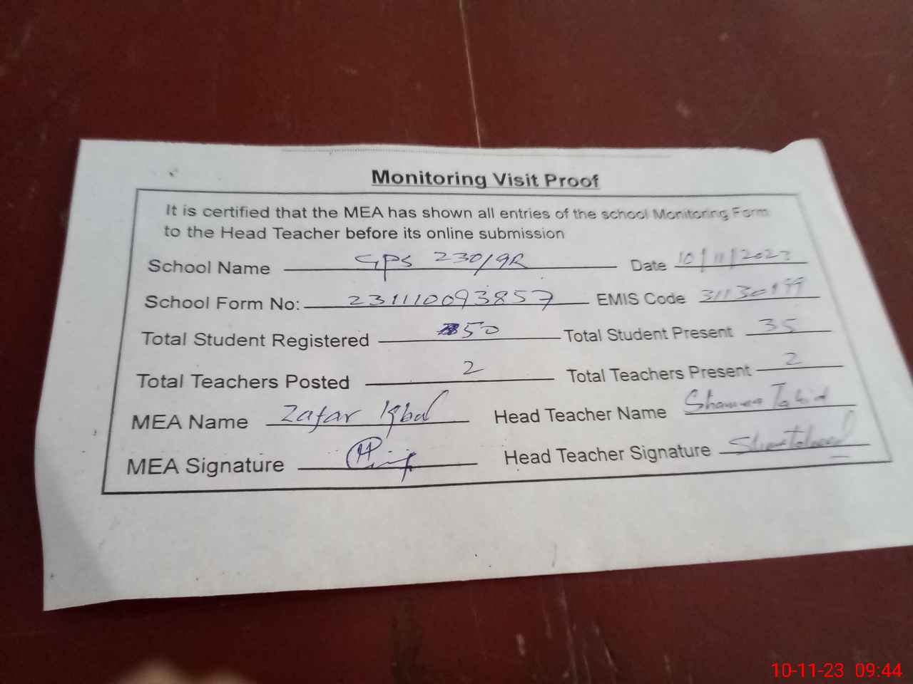 | Attendance Register | Head Teacher | MEA with School | Visit Proof |