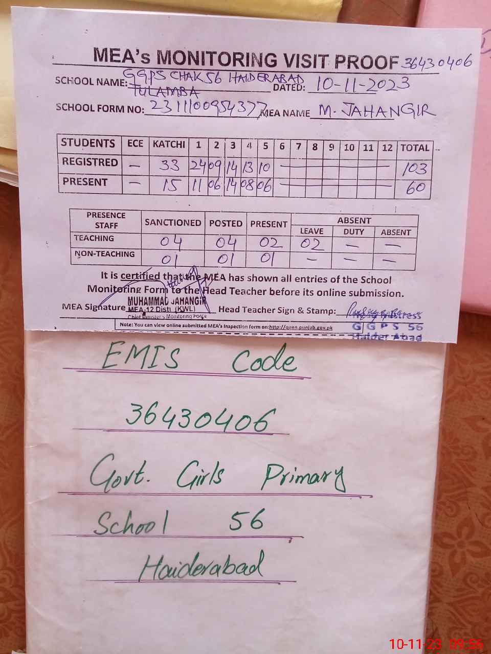 | EMIS Code: 36430406 | Name of School: GGPS CHAK 56 HAIDER ABAD, TULAMBA | |||