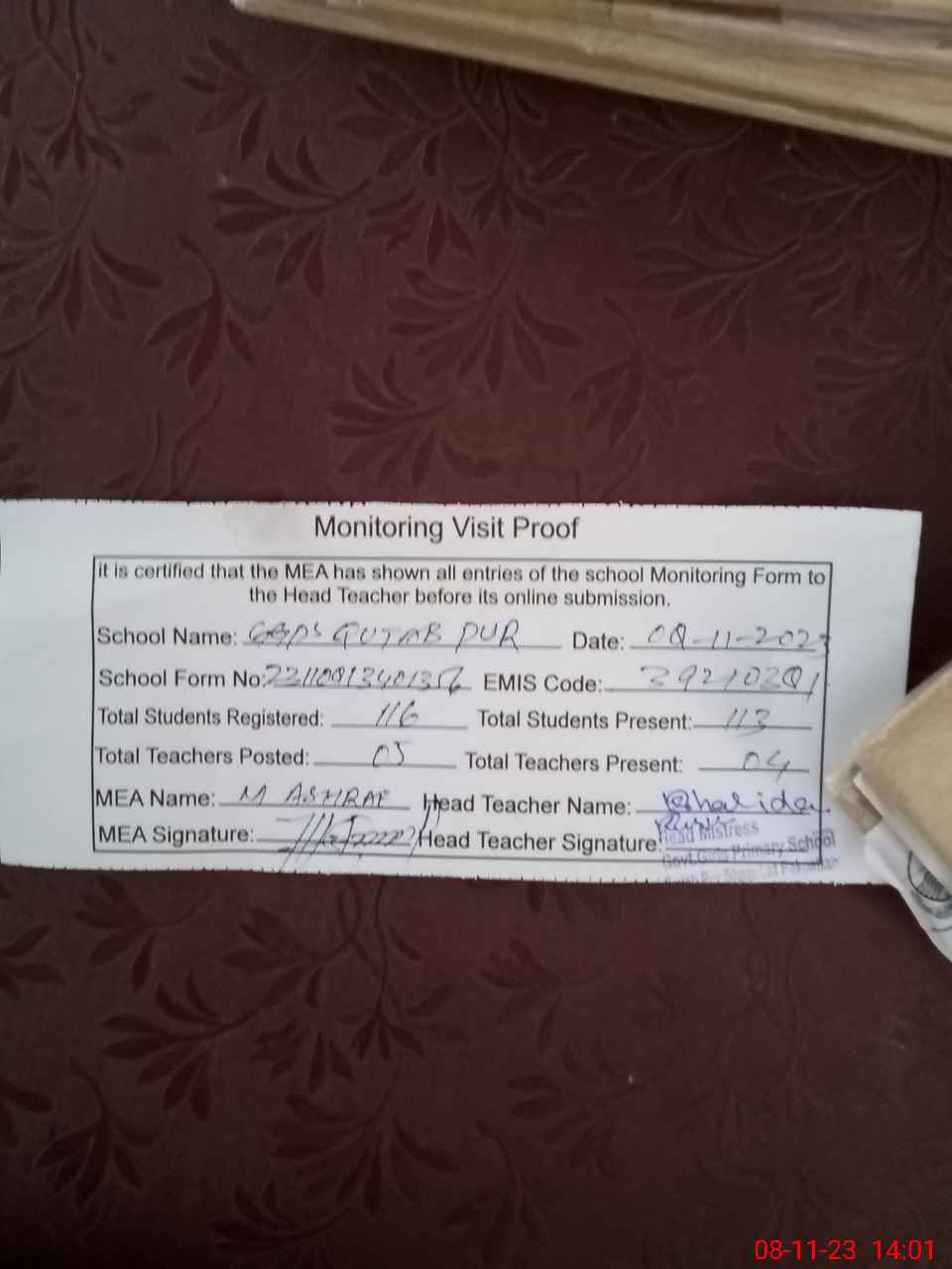 | Attendance Register | Head Teacher | MEA with School | Visit Proof |